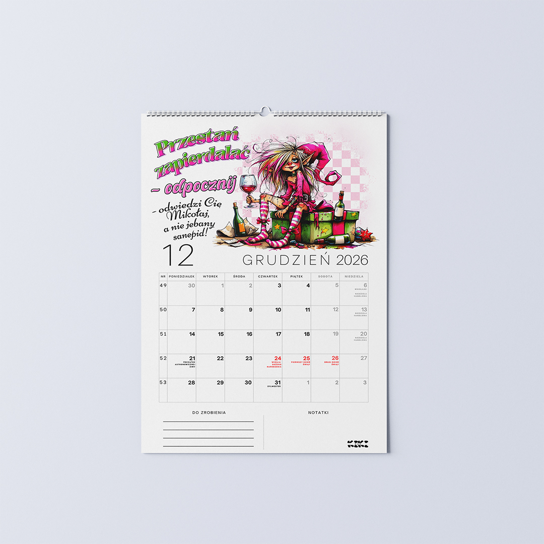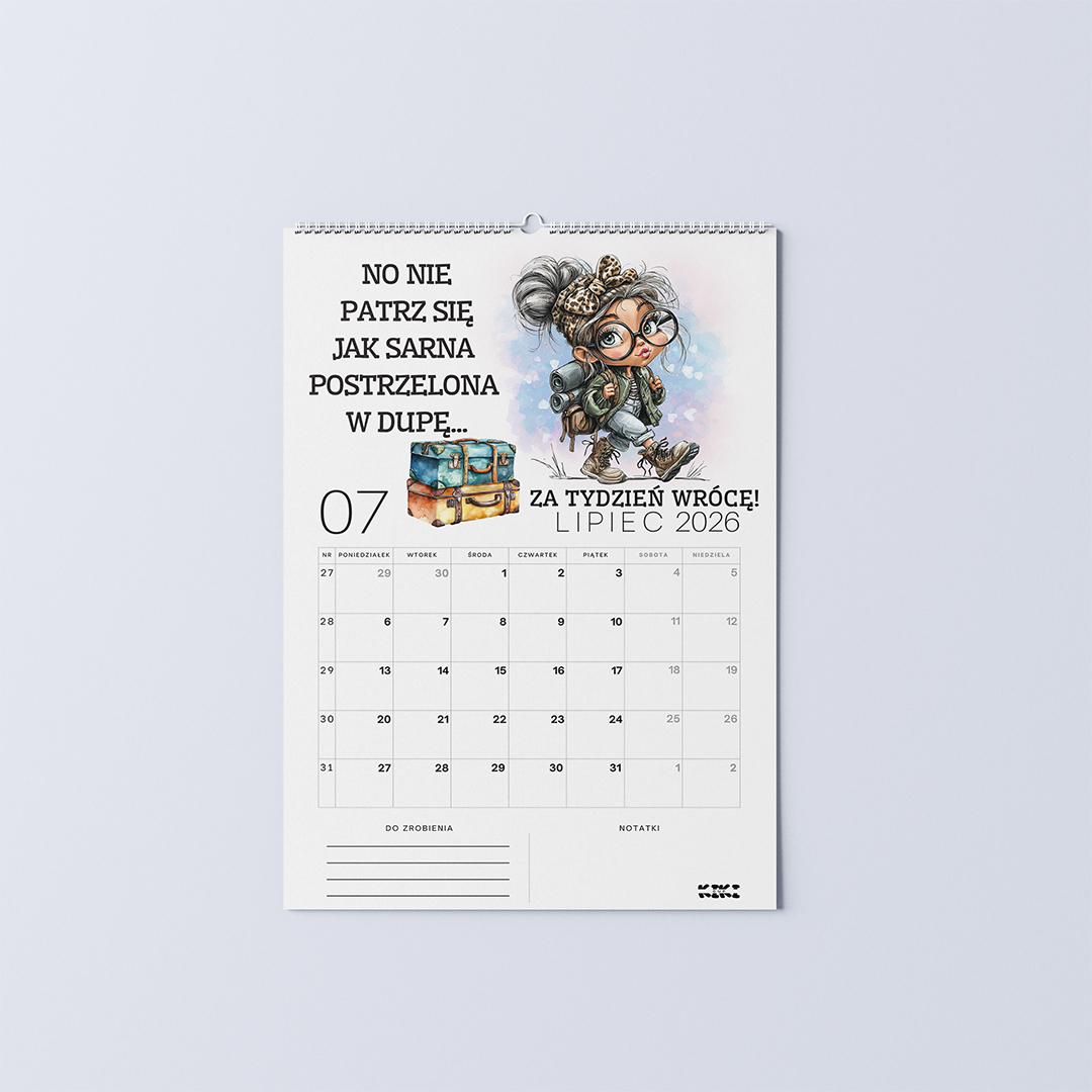 Szukasz kalendarza, który nie będzie nudny po dwóch tygodniach? Kalendarz 2026 (Dla niej) to ścienny planner z serią zabawnych grafik i bezkompromisowych tekstów – dokładnie taki, jak kocha ekipa KikiCup. Każdy miesiąc to świeża ilustracja + mocny komentarz do rzeczywistości: od styczniowych „postanowień” po grudniowe „odsapnij, kobietko”. Dzięki temu kalendarz nie tylko porządkuje dzień, ale też rozładowuje napięcie i wywołuje uśmiech w open space’ie.