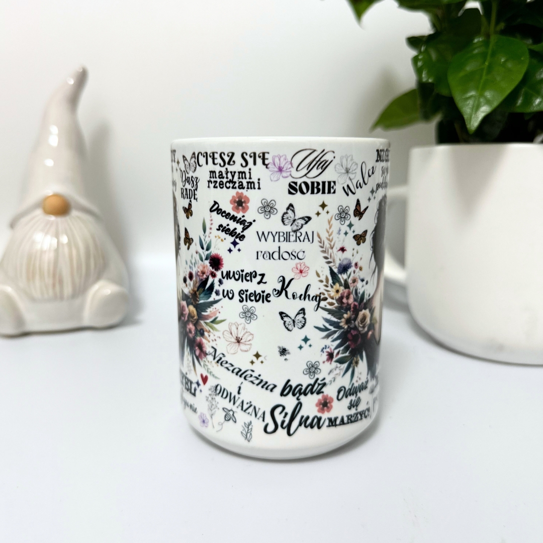Kubek w kolorze białym został ozdobiony trwałym nadrukiem sublimacyjnym, co gwarantuje intensywność kolorów i wysoką jakość wzoru. Na kubku znajdują się pozytywne hasła, które przypominają, aby „wierzyć w siebie”, „wybierać radość”, „cieszyć się małymi rzeczami”, „odważnie marzyć” i „dążyć do celu”. To afirmacje, które wspierają niezależność, odwagę i wewnętrzną siłę – wartości, które każdy z nas pragnie pielęgnować.