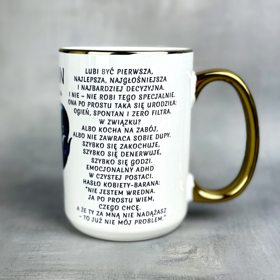 Dwa warianty stylu – klasyczny biały kubek lub opcja ze złotym uchem i rantem – dla tych, którzy lubią błyszczeć… albo podkreślić swój ognisty charakter.