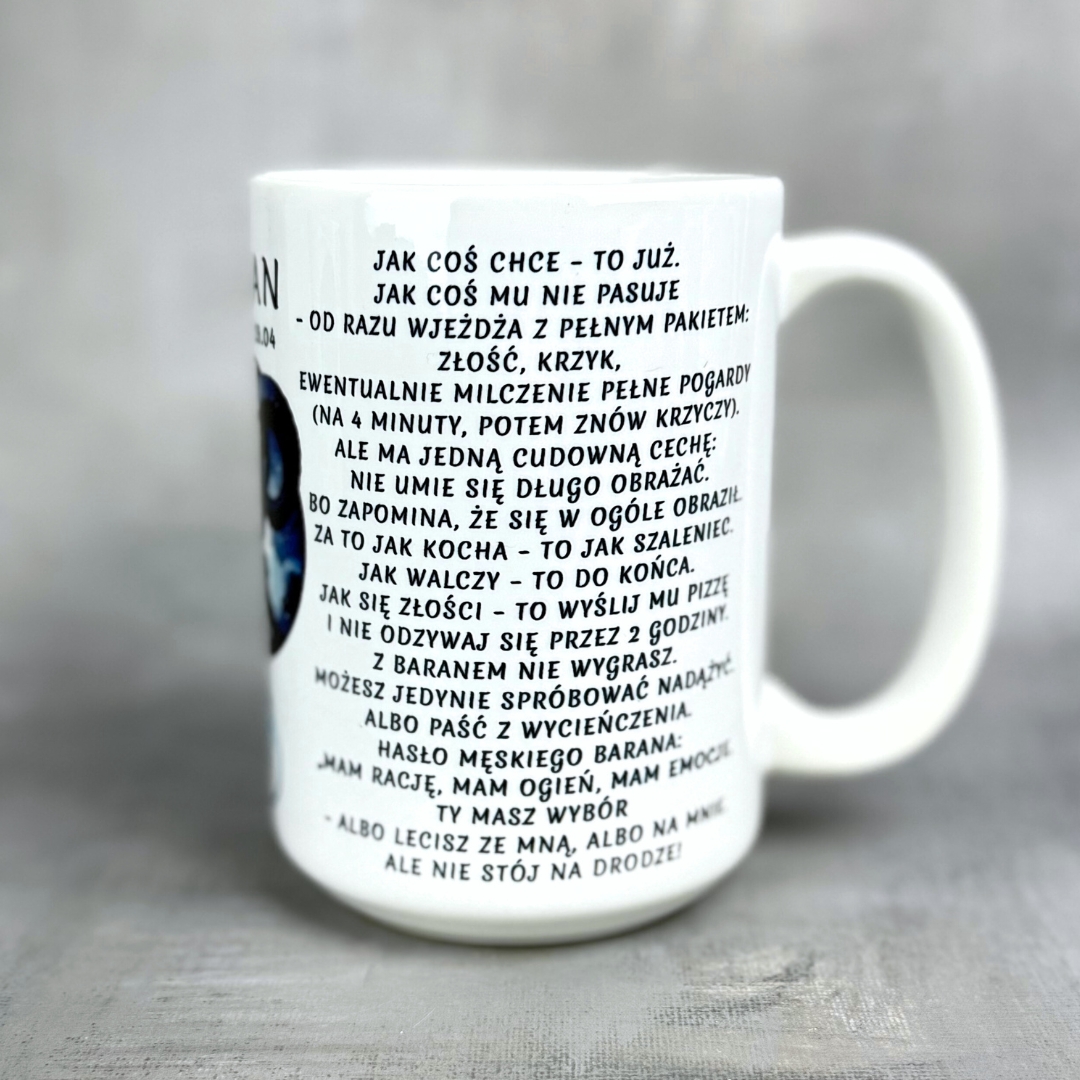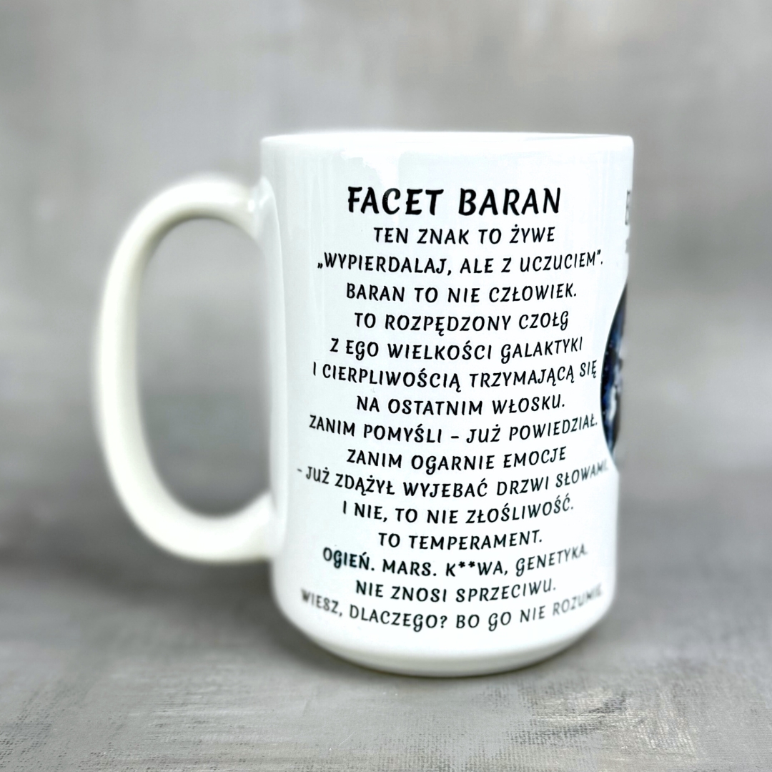 Kubek tylko w wersji 450 ml – ponieważ treść jest długa i intensywna – dokładnie jak Barany – nie zmieści się czytelnie na mniejszym rozmiarze.