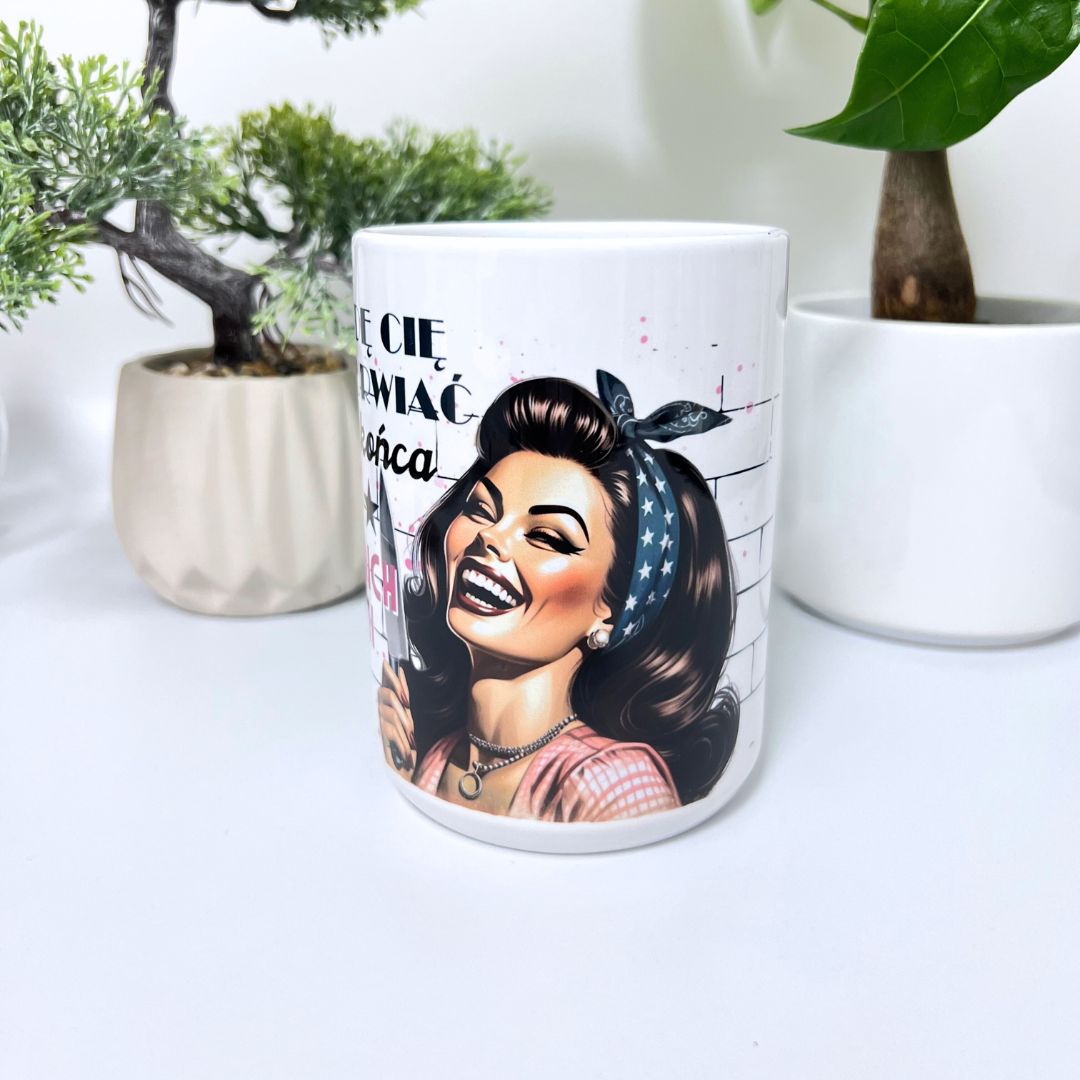 Szukasz oryginalnego gadżetu, który idealnie oddaje Twój charakter? Kubek „Będę cię wkurwiać do końca Twoich dni” to doskonały wybór dla tych, którzy uwielbiają wyraziste wzory, cięty humor i retro estetykę. Grafika przedstawiająca stylową kobietę w klimacie pin-up z zadziornym napisem idealnie sprawdzi się jako codzienny towarzysz przy porannej kawie lub herbacie.
