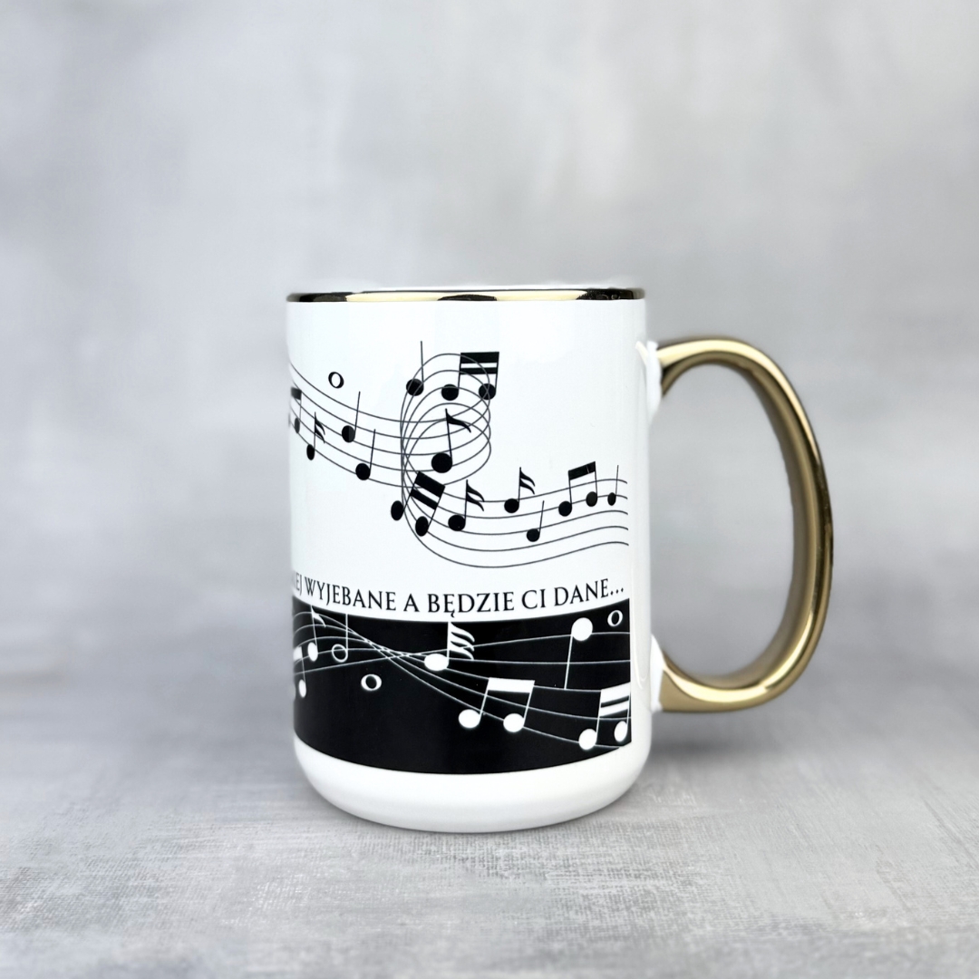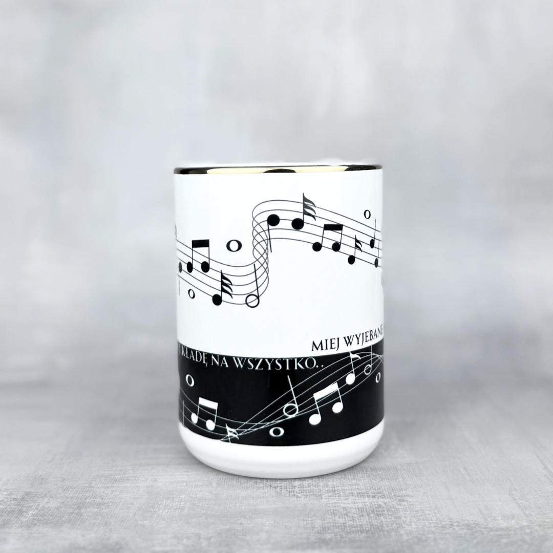 Kubek „Chujowe nuty” – śmieszny kubek ceramiczny 330 ml lub 450 ml pokryty czarno-białym motywem pięciolinii i mocnym „motywującym” cytatem: „A ja, chuj kładę na wszystko… Miej wyjebane, a będzie ci dane”. Do wyboru klasyczny biały lub elegancki wariant ze złotym uchem i rantem. Trwały nadruk sublimacyjny, idealny gadżet do biura i oryginalny prezent dla każdego, kto lubi humor w rytmie forte. Znajdziesz tylko na Kikicup.pl!