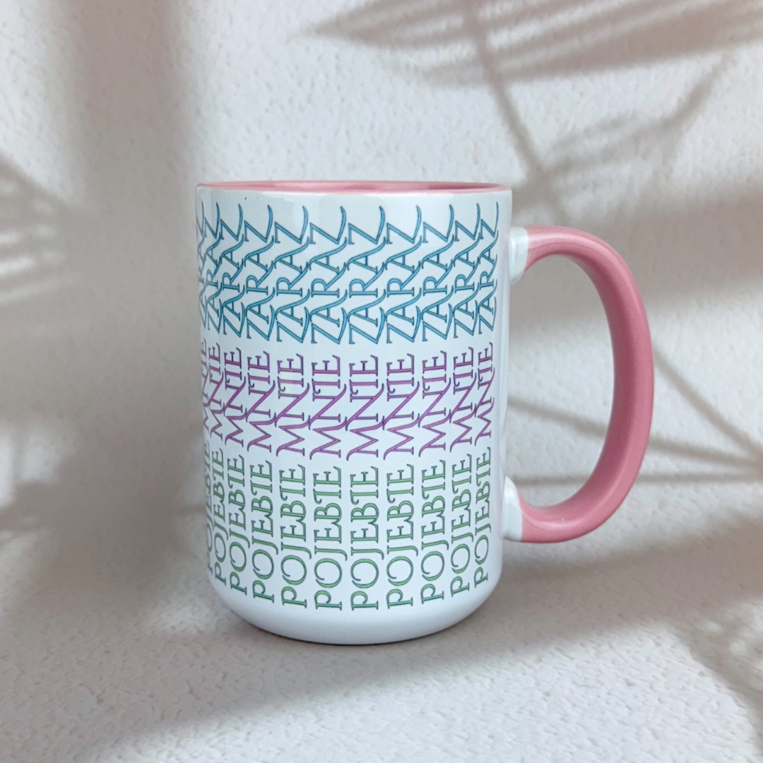 Śmieszny kubek ceramiczny „Pojebie mnie zaraz” w kolorowych szlaczkach to idealny poprawiacz humoru do biura i domu. Dostępny w pojemnościach 330/450 ml: klasyczny biały, z różowym uchem lub w wersji ze złotym uchem. Wysokiej jakości nadruk wykonany metodą sublimacji – ostre kolory, trwałość na lata. Świetny, niegrzeczny prezent dla psiapsi, siostry, współpracownika lub… samej/samego siebie.