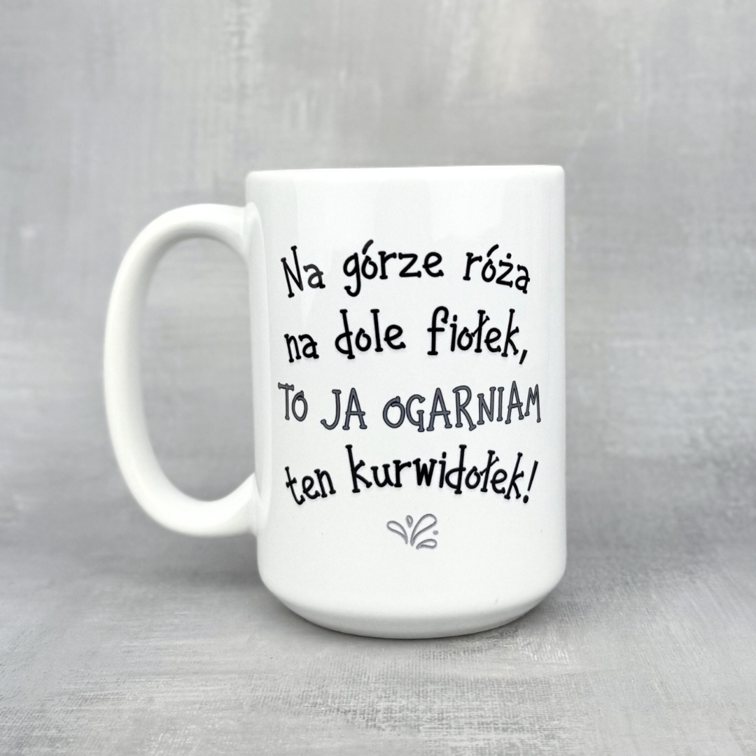 Kubek „Na górze róża, na dole fiołek – to JA ogarniam ten kurwidołek!” – bo ktoś w tym biurze musi ogarniać ☕✨