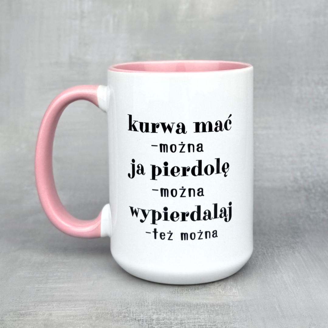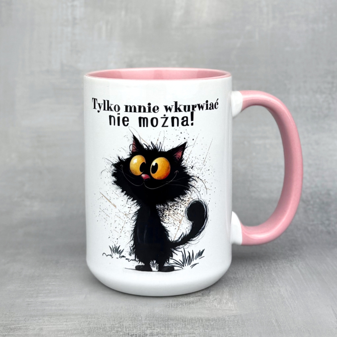 Śmieszny kubek ceramiczny z napisem „Tylko mnie wkurwiać nie można!” i uroczym kotem – idealny do biura i na prezent. Pojemność 330 ml lub 450 ml, klasyczny biały albo wersje kolorowe (m.in. różowe, liliowe, żółte, miętowe, z czarnym uchem oraz Elegant ze złotym uchem). Trwały nadruk wykonany metodą sublimacji. Mocny komunikat, solidne wykonanie – kubek, który poprawia humor przy każdej kawie.